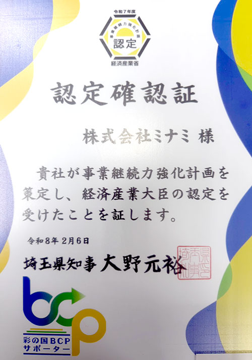 このたび株式会社ミナミは、経済産業省による「事業継続力強化計画」認定を受け、認定確認証を拝受いたしました。
