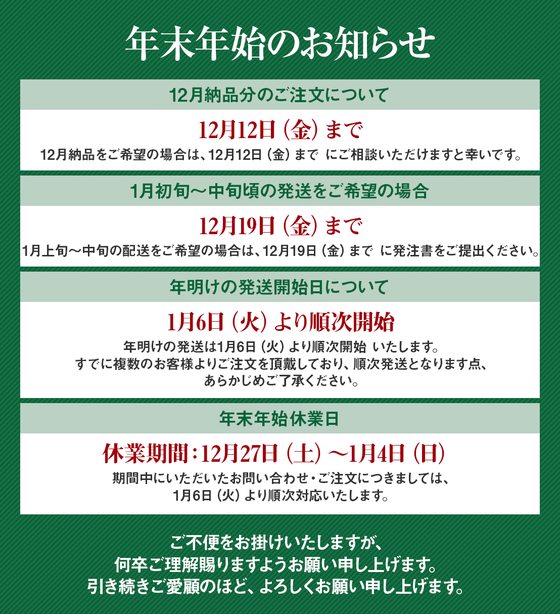 平素より格別のお引き立てを賜り、誠にありがとうございます。年末年始のご注文・出荷スケジュールにつきまして、下記の通りご案内申し上げます。